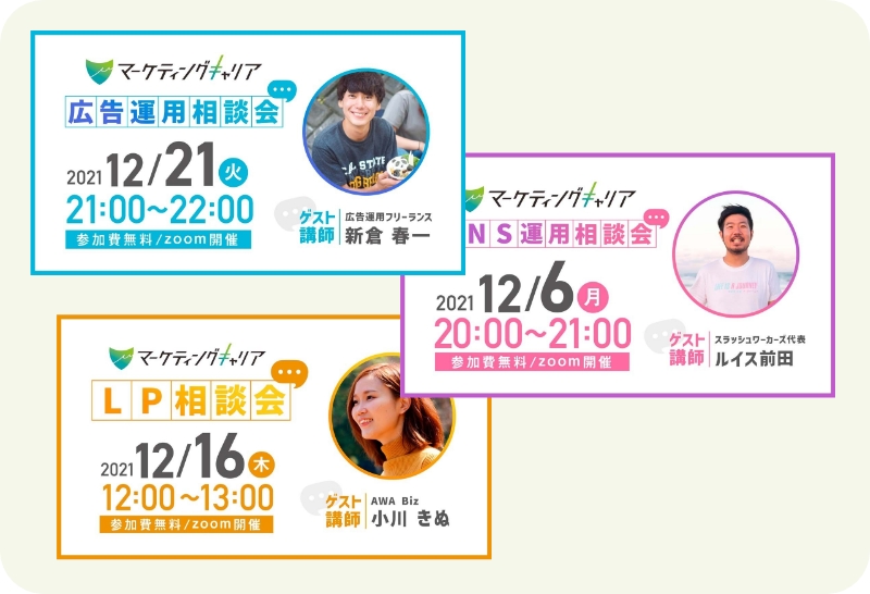 毎週1時間ほどの相談会が開催されており、広告運用・SNS運用・LP設計についてプロのマーケターに相談することができます。 今取り組んでいる案件の相談はもちろん、あなたの事業の課題についても相談が可能。 講座が終わった後も相談できる場が定期的に設けられているので、安心して受講することができます。