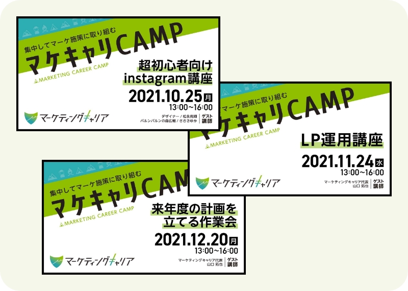 Instagram運用・LP改善・LINEマーケティング・リスティング広告運用など、現役で活躍しているマーケターが月に1回講座を開催し、 最新のマーケティングについて学ぶことができます。講座後にはワークショップも開催され、 具体的なクリエイティブ作成に取り組んだり、あなたが今抱えている課題を相談することができます。